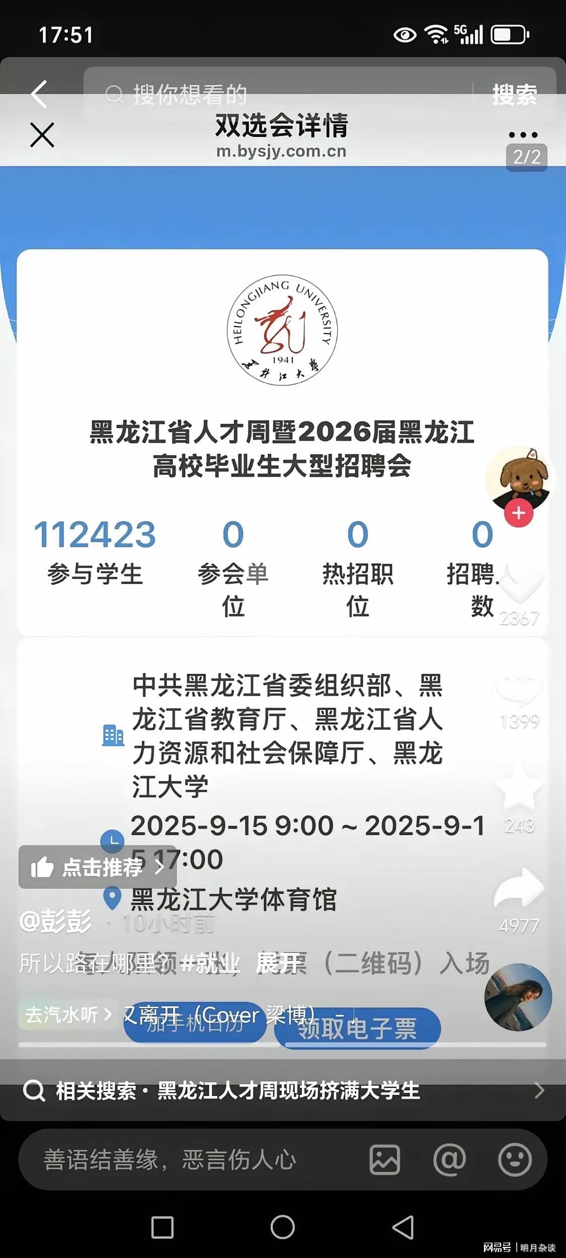 9月15日,黑龙江省组织了高校毕业生招聘会,地点在黑龙江大学。数据显示,竟然有112423人报名参加。