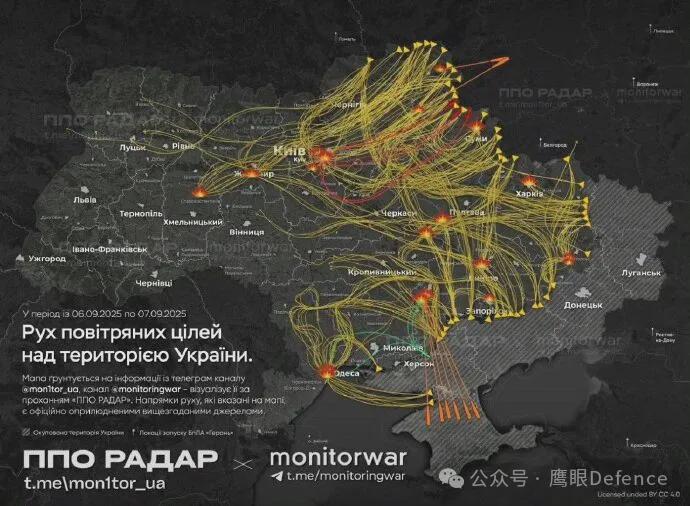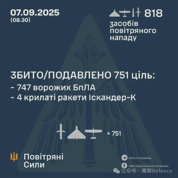 乌克兰军方发布的信息显示,当地时间9月6日夜到7日凌晨的这轮空袭中,俄军总计发射了805架无人机、9枚“伊斯坎德尔-K”巡航导弹和4枚“伊斯坎德尔-M”或KN-23弹道导弹,乌克兰空军、防空部队、电子战部队和机动火力小组击落、压制了747架无人机和4枚巡航导弹,其中五分之一的俄军无人机是被FPV无人机击落的,但乌克兰境内依然有37处地点被9枚导弹和56架无人机击中,另有8处地点因无人机残骸坠落受损。