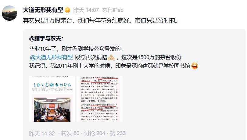对此,段永平在其雪球账号“大道无形我有型”的主页上表示:“其实只是1万股茅台,他们每年花分红就好。市值只是暂时的。”