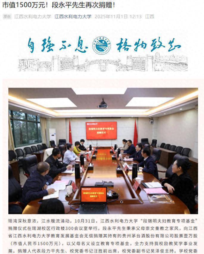段永平向江西省江西水利电力大学教育发展基金会无偿捐赠其持有的贵州茅台酒股份有限公司股票壹万股(市值人民币1500万元),以父母名义设立教育专项基金,全力支持该校励教奖学事业发展。